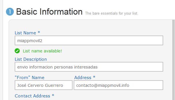 Ahora toca rellenar la información básica de tu lista. Algunas cosas de las que vas a poner aquí las verán tus suscriptores cuando reciban tus correos otras en cambio sólo las puedes ver tú desde tu cuenta de AWeber.