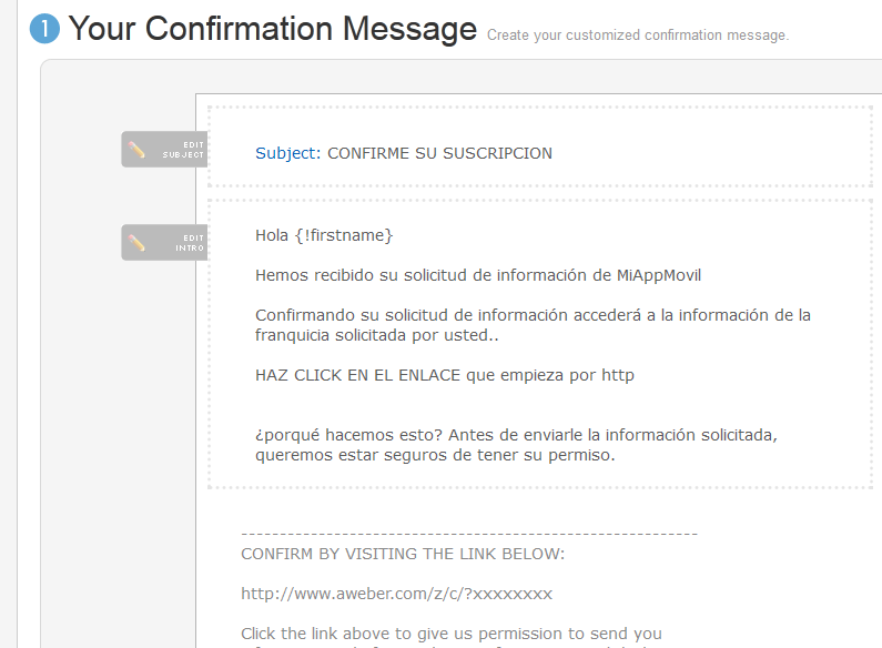 Justo debajo te muestro un ejemplo de mensaje de confirmación para que puedas utilizarlo como modelo. Hay tres áreas que se pueden editar, aprovéchalo para poner texto en el idioma del lector del email (español) para facilitar que éste sepa que hacer para suscribirse a la newsletter, es decir, clicar en el enlace.