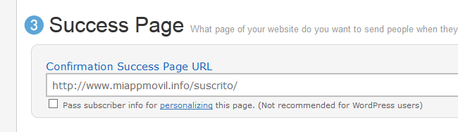 Crea en tu página web una página de bienvenida para que quien clique en el enlace de confirmación reciba tu agradecimiento y cualquier otra información que le quieras dar de tu newsletter. Copia la URL y pégala donde pone “Confirmation success page URL”. Mira mi página de bienvenida y utilízala de modelo si quieres.
